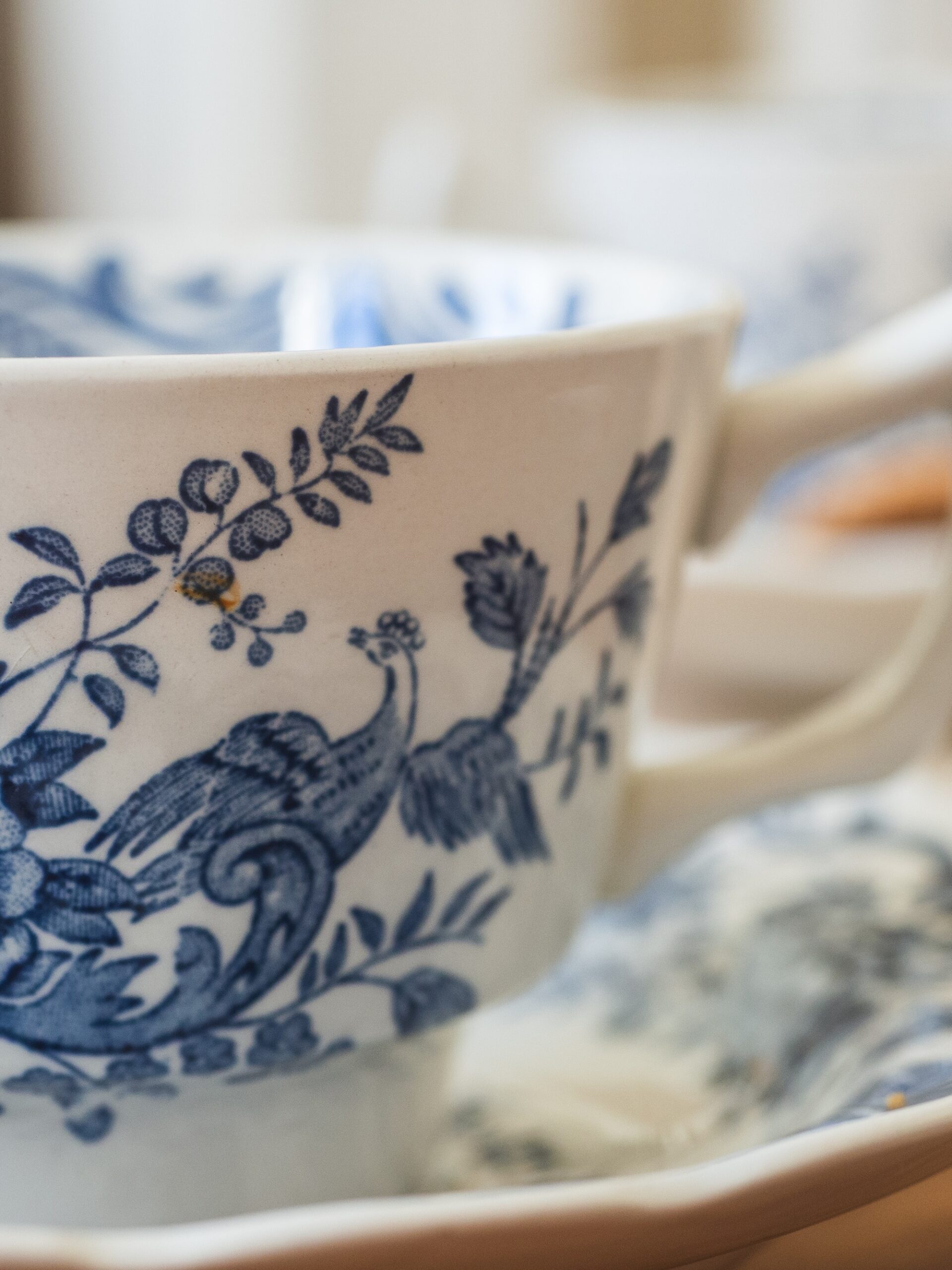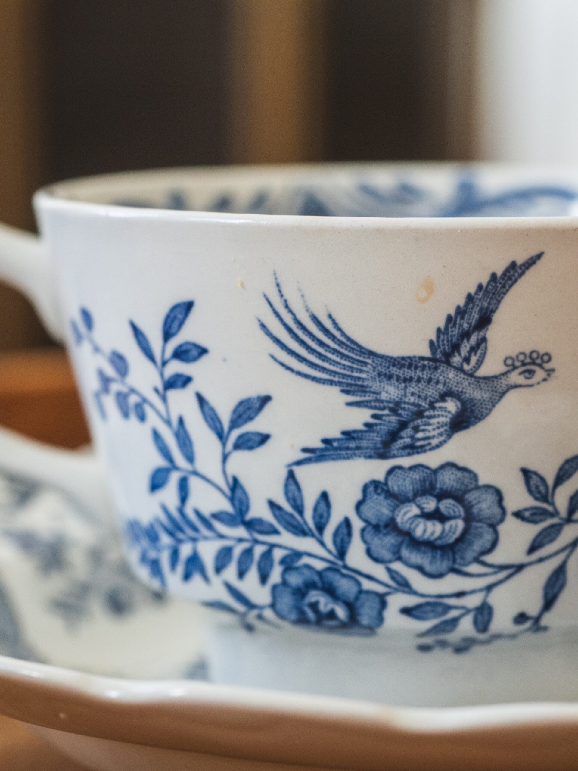 Une tasse aux belles nuances de bleu avec une illustration double aux motifs de fleurs et oiseaux en vol, accompagnée de sa soucoupe.